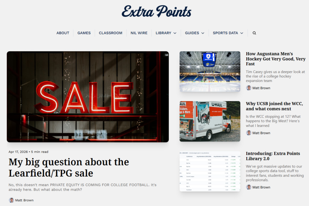 Extra Points a site and newsletter that is dedicated to all the off-the-field factors that shapes college sports, from the largest FBS schools to the smallest NAIA programs as well as commentary, analysis and original reporting on major issues like NIL legislation, how college athletic budgets function, how athletic departments fit (and don’t fit) with the rest of the university, and how the entire enterprise really operates. Extra Points has amassed a following of over 5,000 newsletter subscribers and 15,000 followers on Twitter.